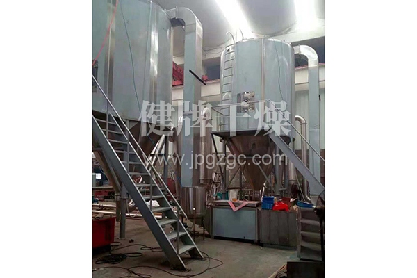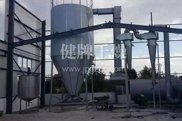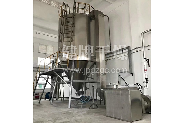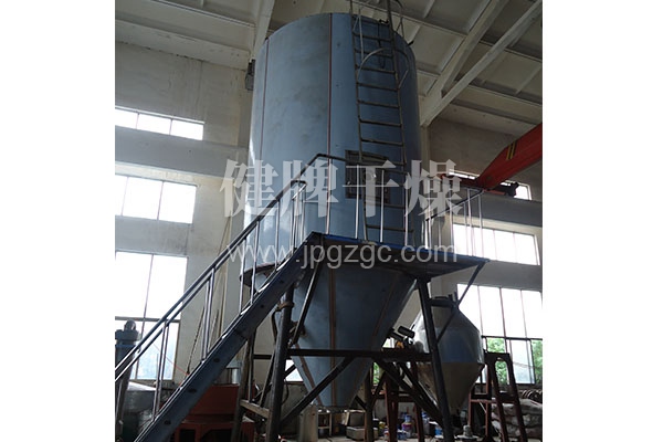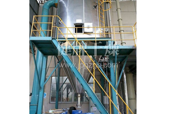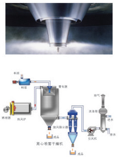 空氣經(jīng)過(guò)過(guò)濾和加熱,進(jìn)入干燥器頂部空氣分配器,熱空氣呈螺旋狀均勻地進(jìn)入干燥室。料液經(jīng)塔體頂部的高速離心霧化器,(旋轉)噴霧成極細微的霧狀液珠,與熱空氣并流接觸,在極短的時(shí)間內可干燥為成品。成品連續地由干燥塔底部和旋風(fēng)分離器中輸出,廢氣由風(fēng)機排空。