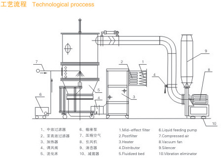 物料粉末粒子,在原料容器(流化床)中呈環(huán)形流化狀態(tài),受到經(jīng)過(guò)凈化后的加熱空氣預熱和混合,將粘合劑溶液霧化噴入,使若干粒子聚集成含有粘合劑的團粒,由于熱空氣對物料的不斷干燥,使團粒中水分蒸發(fā),粘合劑凝固,此過(guò)程不斷重復進(jìn)行,形成理想的、均勻的多微孔球狀顆粒。